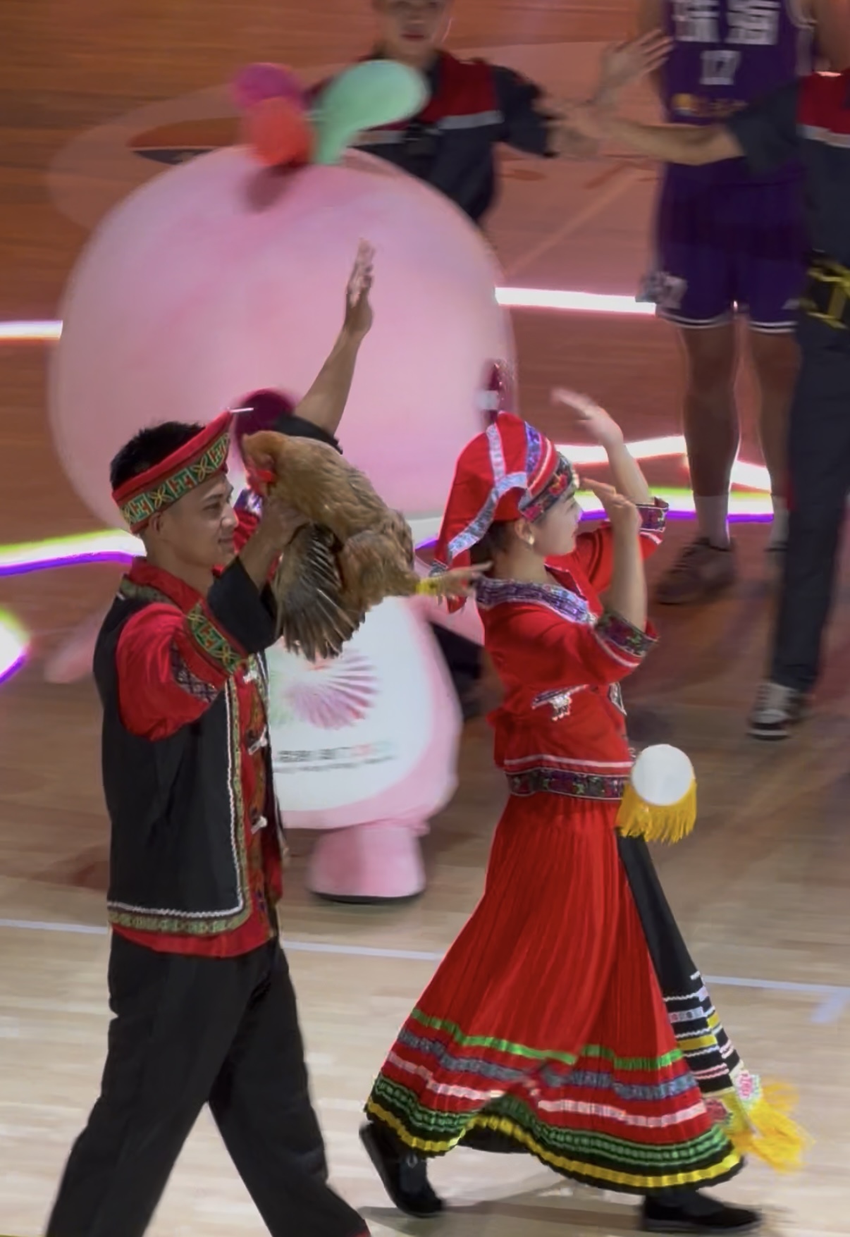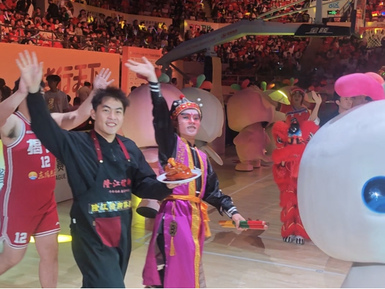 清远代表手提色泽鲜亮的清远鸡稳步走来,清远鸡皮爽肉嫩的特质早已深入人心,成为清远最具代表性的名片之一;湛江的新鲜生蚝、徐闻菠萝也亮相赛场,带着海洋的鲜甜与热带的果香,瞬间勾起现场观众的味蕾期待;茂名化橘红、梅州柚、江门新会陈皮、云浮郁南无核黄皮、揭阳隆江猪脚饭等特色物产也一一亮相,每一件都承载着当地的风土人情与匠心积淀,从粤北的山野珍味到粤西的海产佳味,从粤东的风味美食到珠三角的特色干货,21城广货同台绽放,构成了一幅鲜活的“广东物产地图”,让现场观众在感受篮球激情的同时,近距离触摸广货的独特魅力。